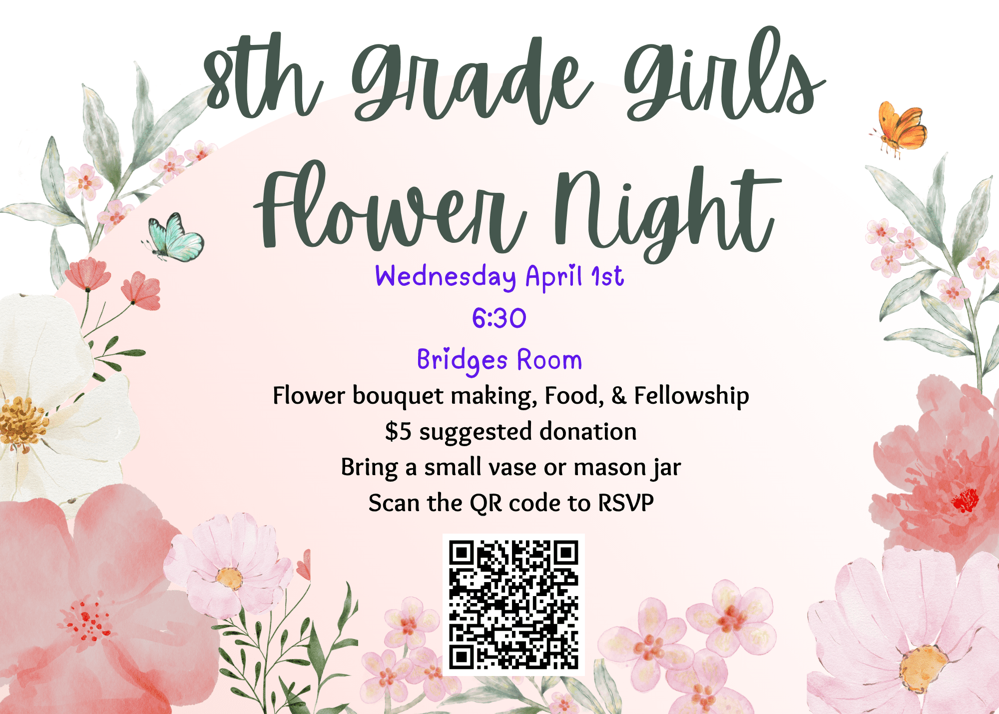 RSVP required $5 suggested donation Bring a small vase or mason jar 8th grade girls, join us for a night of flower bouquet making, food and fellowship.