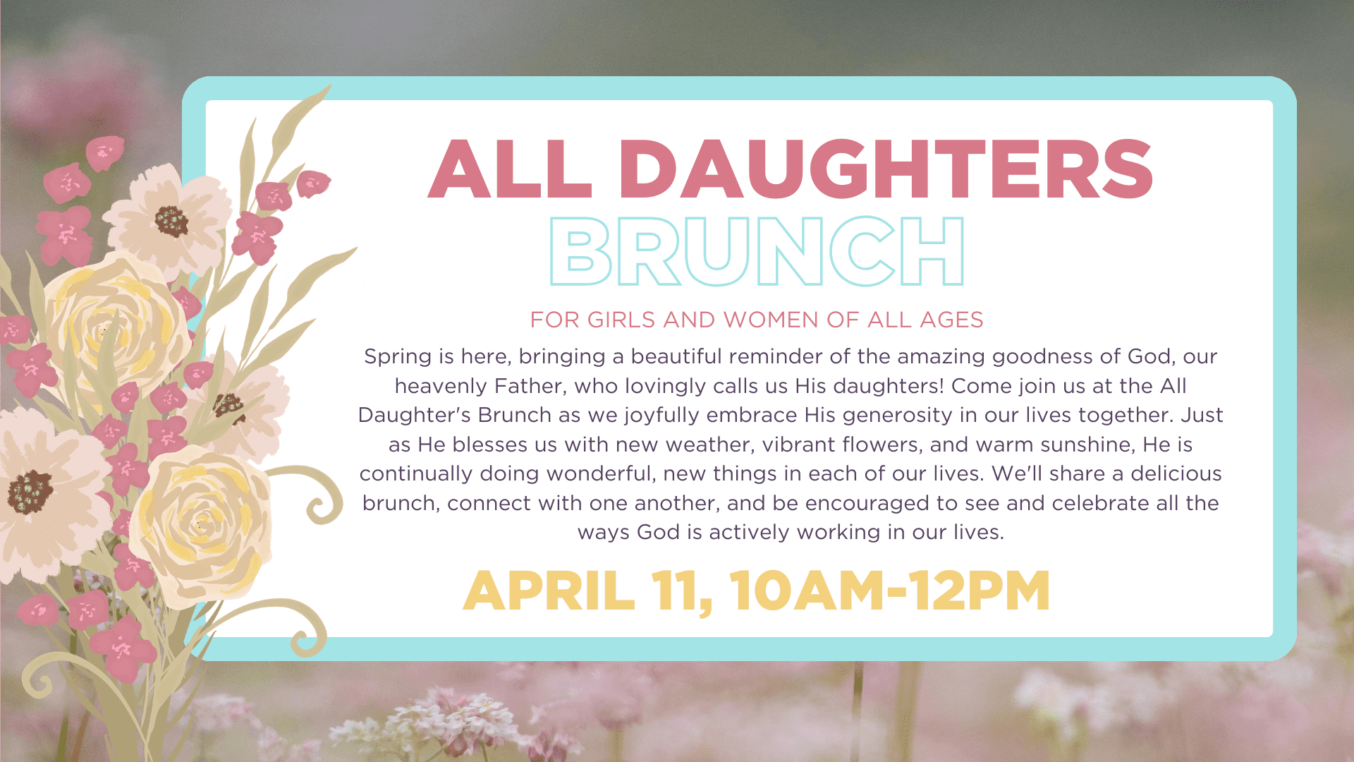 All Daughters Brunch: EXPECT NEW THINGS Apr 11 All Daughters Brunch: EXPECT NEW THINGS 10:00 am - 12:00 pm $5